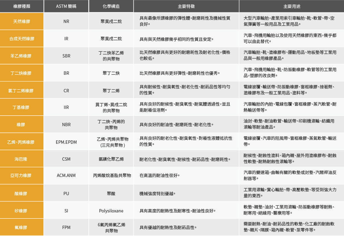 橡膠種類特徵/用途
